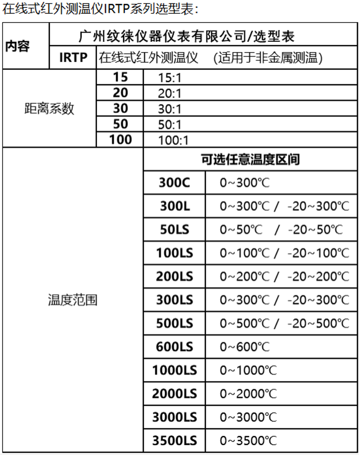 广州纹徕仪表厂IRTP-500LS红外测温传感器包括广泛的选择温度范围,距离系数和各种信号输出(即 4-20mA,0-5V, 0-10V, 1-5V,E,K, RS -485或RS-232)。